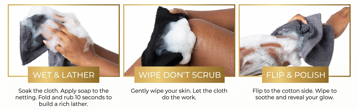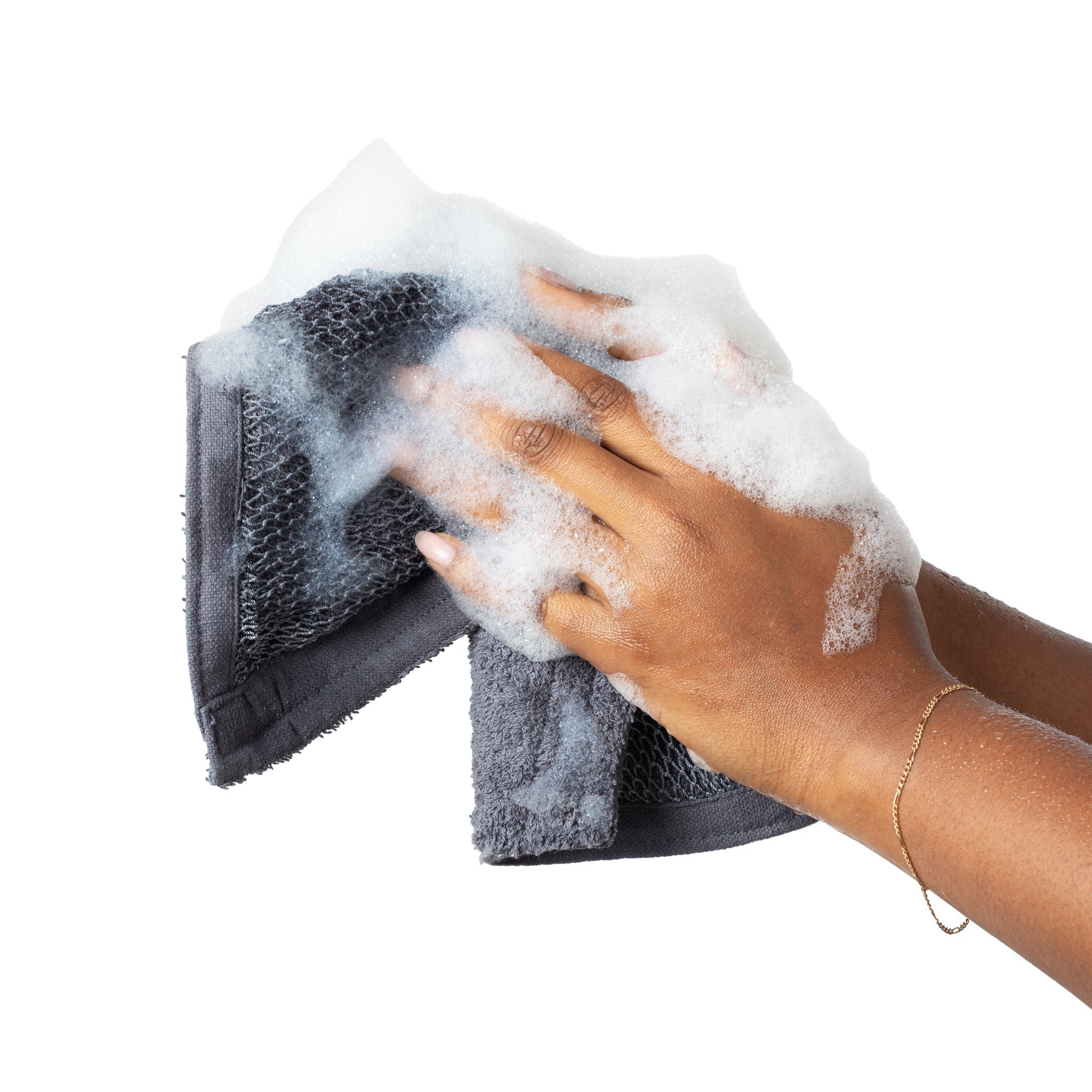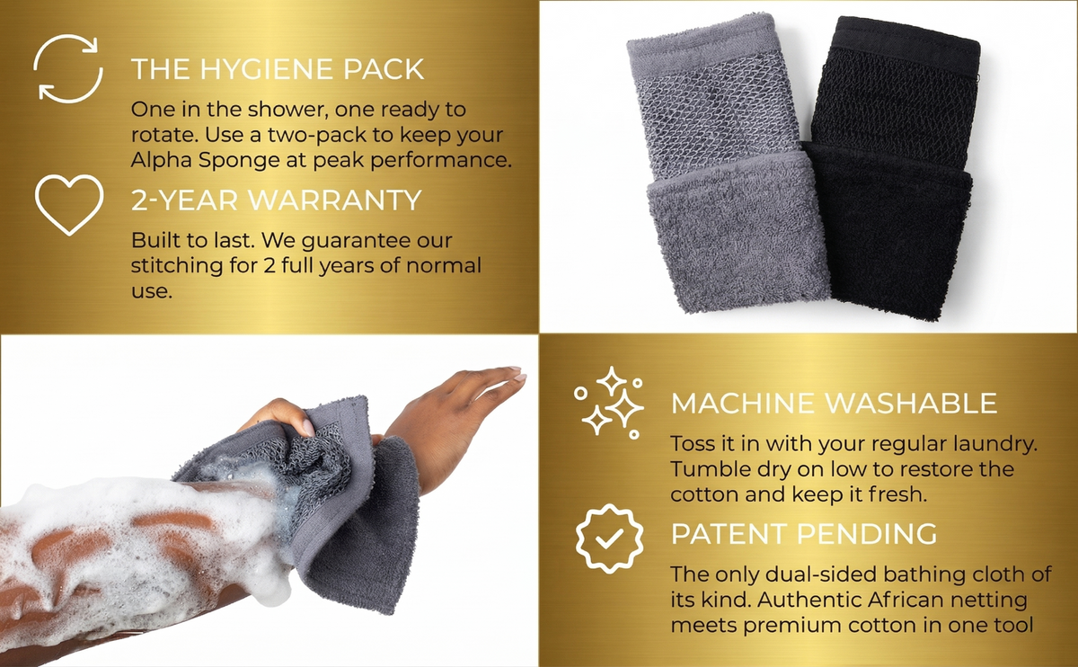 Meet the Alpha Sponge Premium Exfoliation Cloth—your skin’s new best friend for a fresh, healthy glow. We call it the Two-Step Reset. On one side, the unique nylon netting gets right to work clearing away rough patches, tiny bumps, and clogged pores for a truly deep clean. Flip it over to the plush, 100% cotton side to gently soothe and wash your skin, perfect for your most delicate and sensitive areas. It’s more than a daily wash; it's a way to wash away the daily grind. Choose the deep scrub you need or the gentle touch you deserve, all in one easy-to-use 10x10 inch cloth.